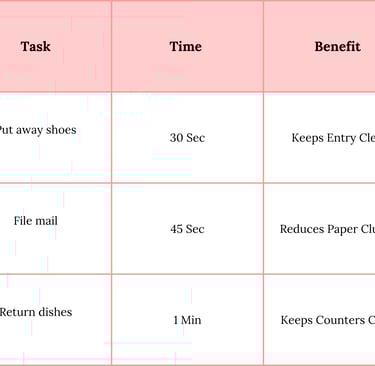 Apply the one-minute rule to stop small tasks from turning into bigger ones. If a task takes less than a minute—like hanging a coat, putting mail in the recycling, or returning a cup to the kitchen—do it right away.