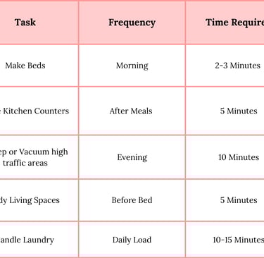 Spend five to ten minutes each day resetting these areas. Wipe down counters, clear tables, and return misplaced items. This daily reset keeps clutter from spreading into other rooms.