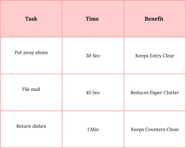 This rule reduces mental load and keeps surfaces clear. Instead of letting small items accumulate, you handle them in real time. Over a day, these quick actions prevent clutter from spreading across tables, counters, and floors.