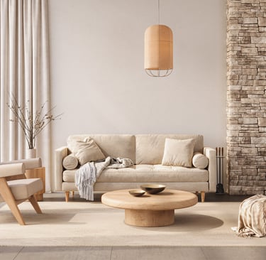 How to use it: Keep furnishings minimal to create an uncluttered look, but layer in warm tones, natural materials, and tactile pieces that not only add comfort without clutter but also enhance the overall aesthetic of your space. Incorporate textiles that offer a soft touch, such as linen or wool, and choose wood finishes that showcase the beauty of natural grains. Adding elements like plants can bring life and a touch of nature into your minimalistic design, further enhancing the warmth and inviting atmosphere.