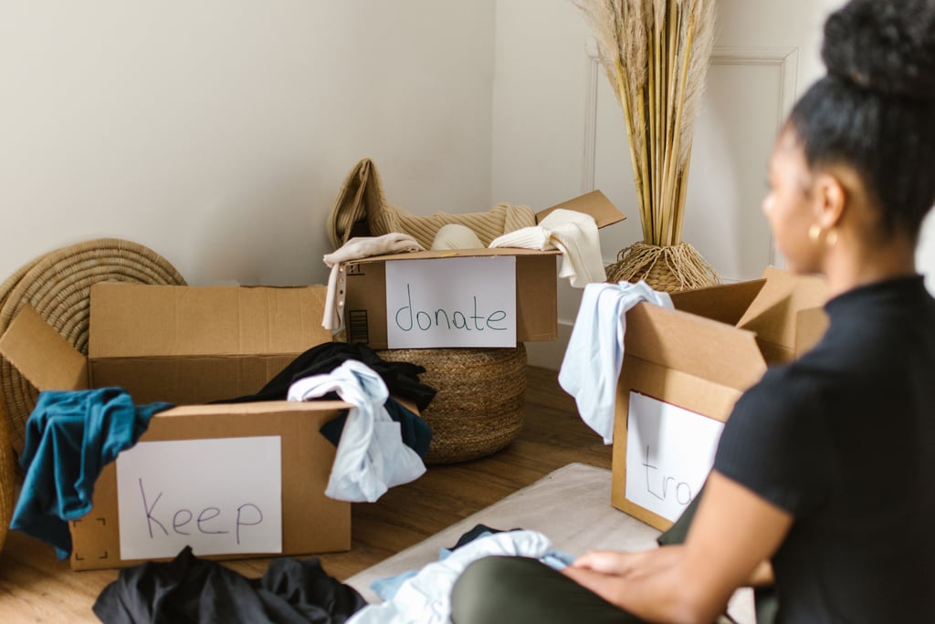 Set up four containers before you begin. Label them "Keep," "Donate," "Trash," and "Relocate" for things that belong somewhere else.