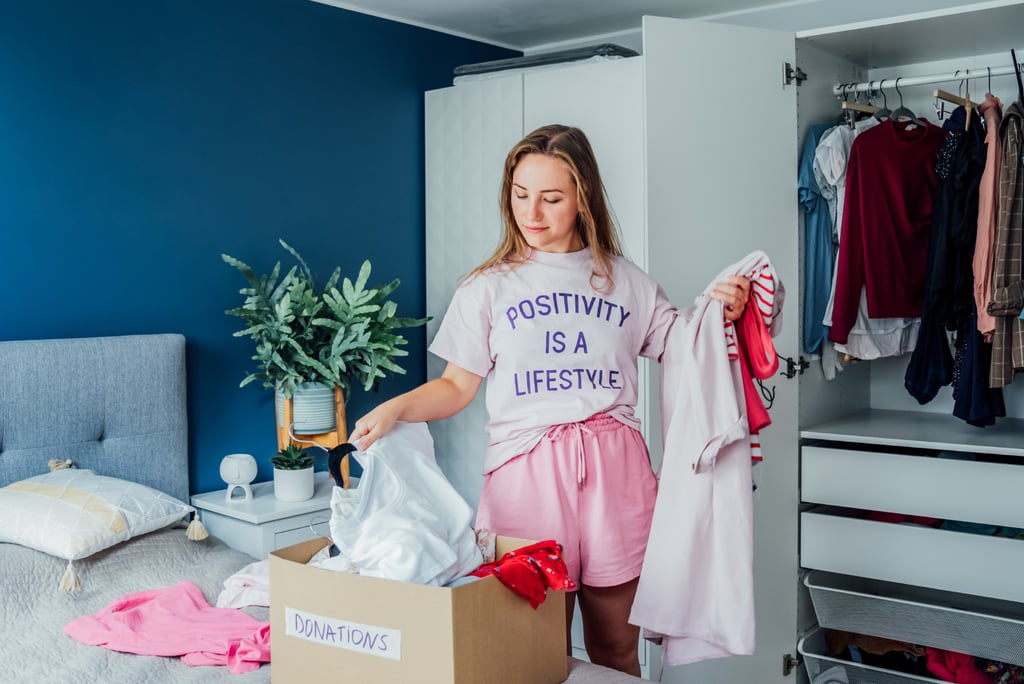 Go through your closet and pull out clothes you haven’t worn in six months. Keep only what fits and makes you feel good. Use the four-box method for sorting: keep, donate, trash, and relocate.