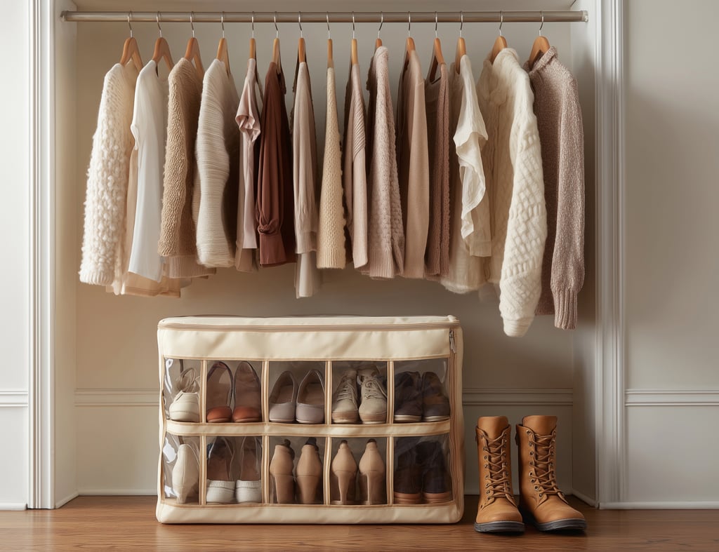 Check under the bed as it’s usually hiding forgotten stuff. Pull it all out, vacuum, and only store things you actually need, like off-season clothes in flat containers. Organizing your closet systematically keeps clothes from piling up again.