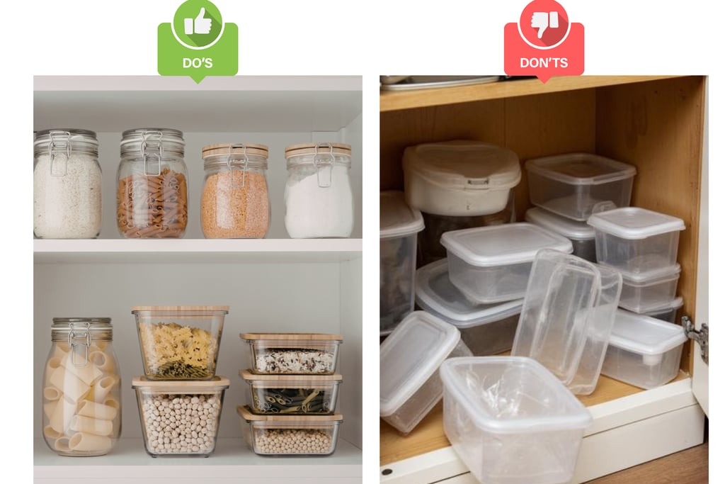 Container storage works best if you stick with one set that has interchangeable lids. Go for square or rectangular ones as they stack better and take up less space than a jumble of random containers.
